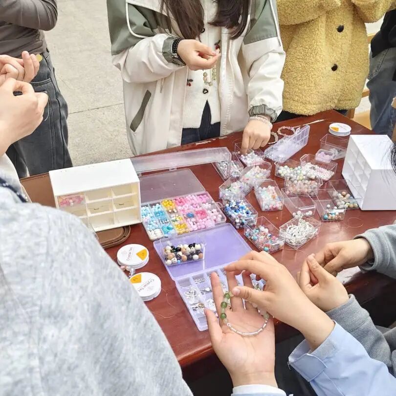 本次活动邀请校内各友好社团、手工爱好者齐聚现场,解锁串珠、漆扇、拼豆、扭扭棒四大玩法!创意不设限,随心搭配超快乐。